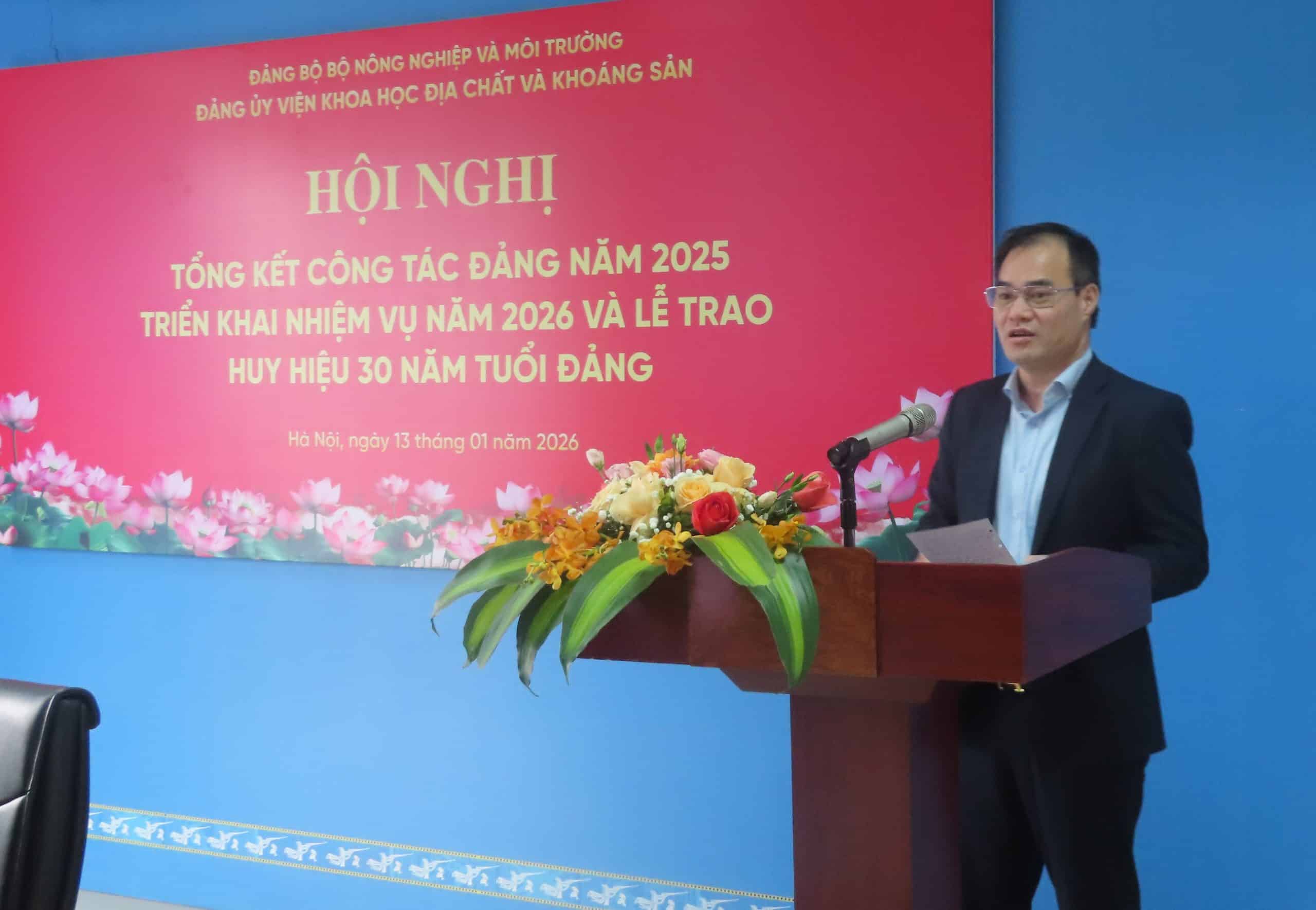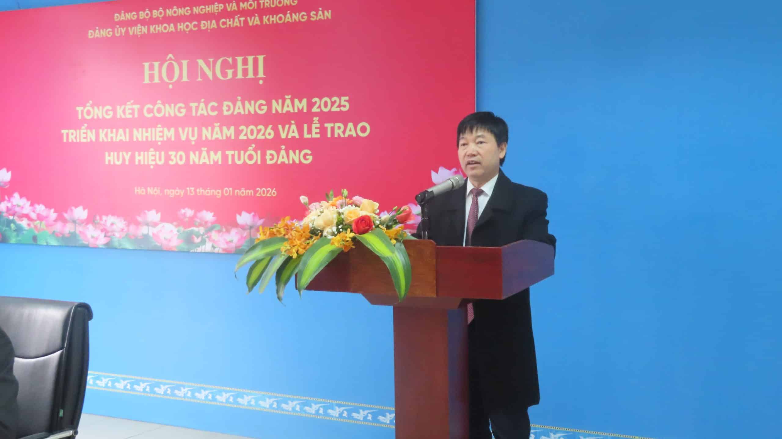Thực hiện chương trình công tác năm 2025, sáng ngày 13 tháng 01 năm 2026, Đảng bộ Viện Khoa học Địa chất và Khoáng sản đã tổ chức Hội nghị tổng kết công tác Đảng năm 2025, triển khai nhiệm vụ năm 2026. Hội nghị là dịp quan trọng nhằm đánh giá toàn diện kết quả lãnh đạo, chỉ đạo thực hiện nhiệm vụ chính trị, công tác xây dựng Đảng trong năm 2025; đồng thời xác định phương hướng, nhiệm vụ, giải pháp trọng tâm cho năm 2026.