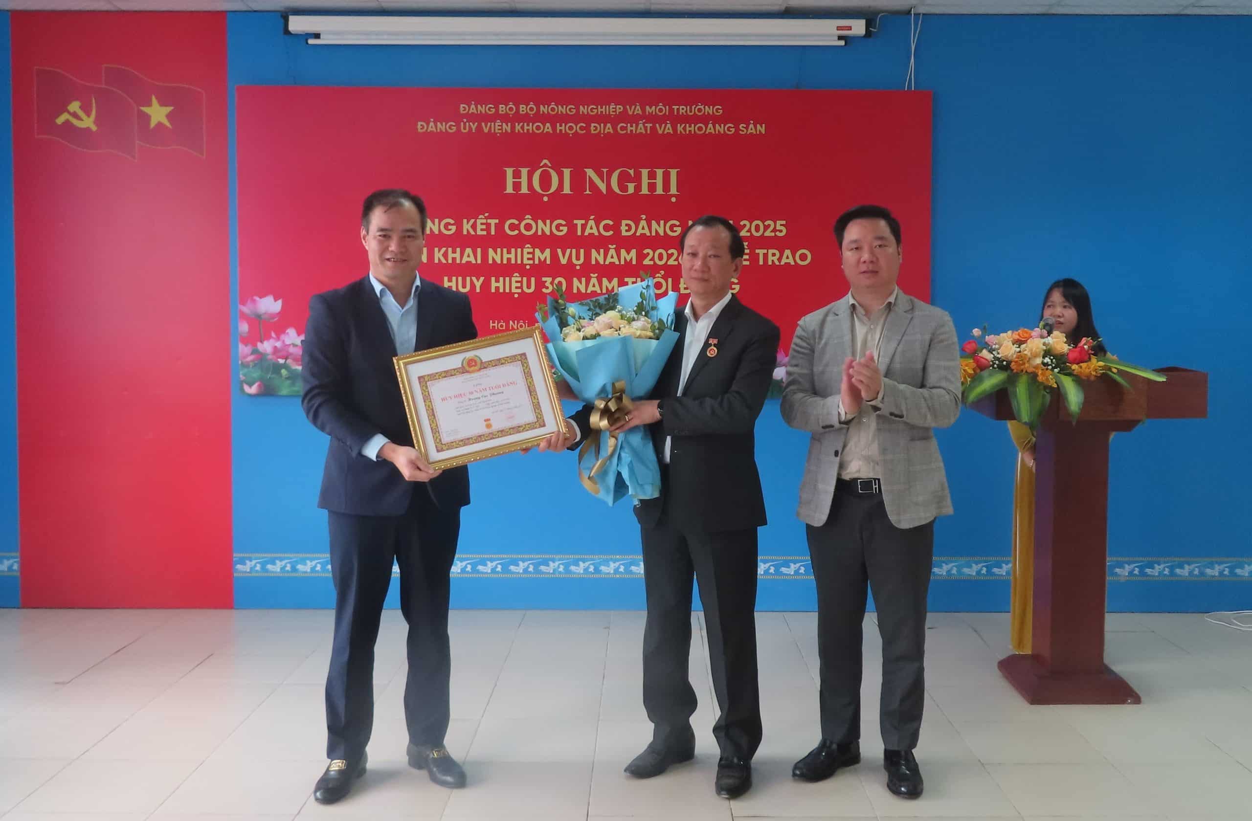 Nhân dịp này, Đảng bộ Viện Khoa học Địa chất và Khoáng sản đã long trọng tổ chức trao Huy hiệu 30 năm tuổi Đảng cho đồng chí Hoàng Cao Phương – đảng viên Đảng bộ Viện. Đây là phần thưởng cao quý của Đảng, ghi nhận quá trình phấn đấu, rèn luyện bền bỉ, sự kiên trung về bản lĩnh chính trị, tinh thần trách nhiệm và những đóng góp quan trọng của đồng chí đối với sự nghiệp xây dựng Đảng và phát triển của Viện trong suốt 30 năm qua.